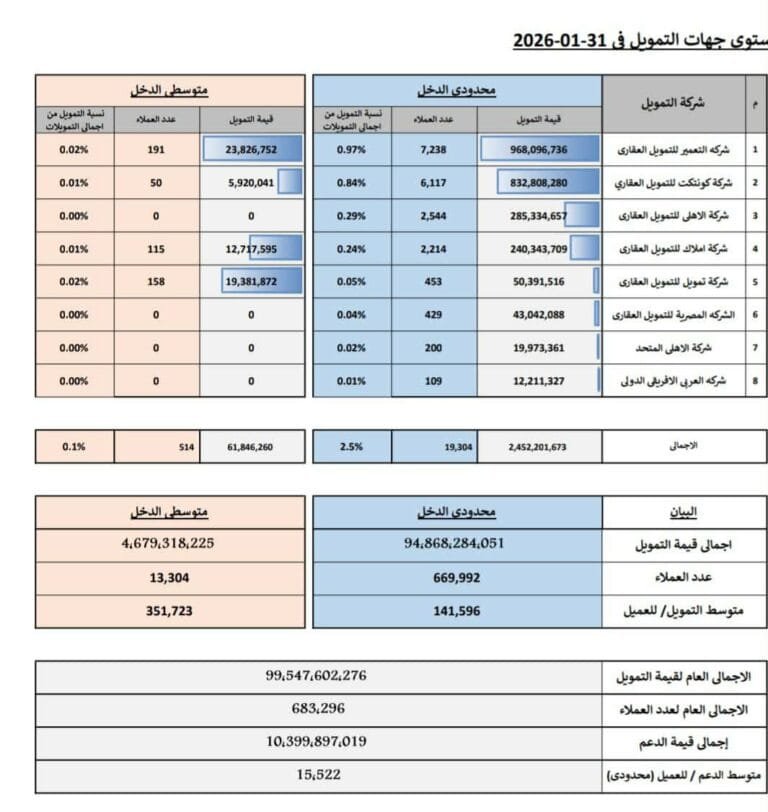 وفقًا لتقرير صندوق الإسكان الاجتماعي ودعم التمويل العقاري، بلغت تمويلات البنوك المصرية 97 مليار جنيه حتى نهاية يناير 2026، مقسمة كالتالي: