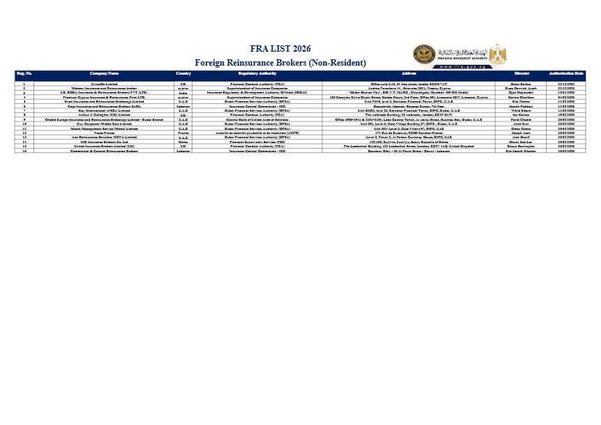 القائمة الحالية لوسطاء إعادة التأمين الأجانب غير المقيمين تضم 16 شركة.