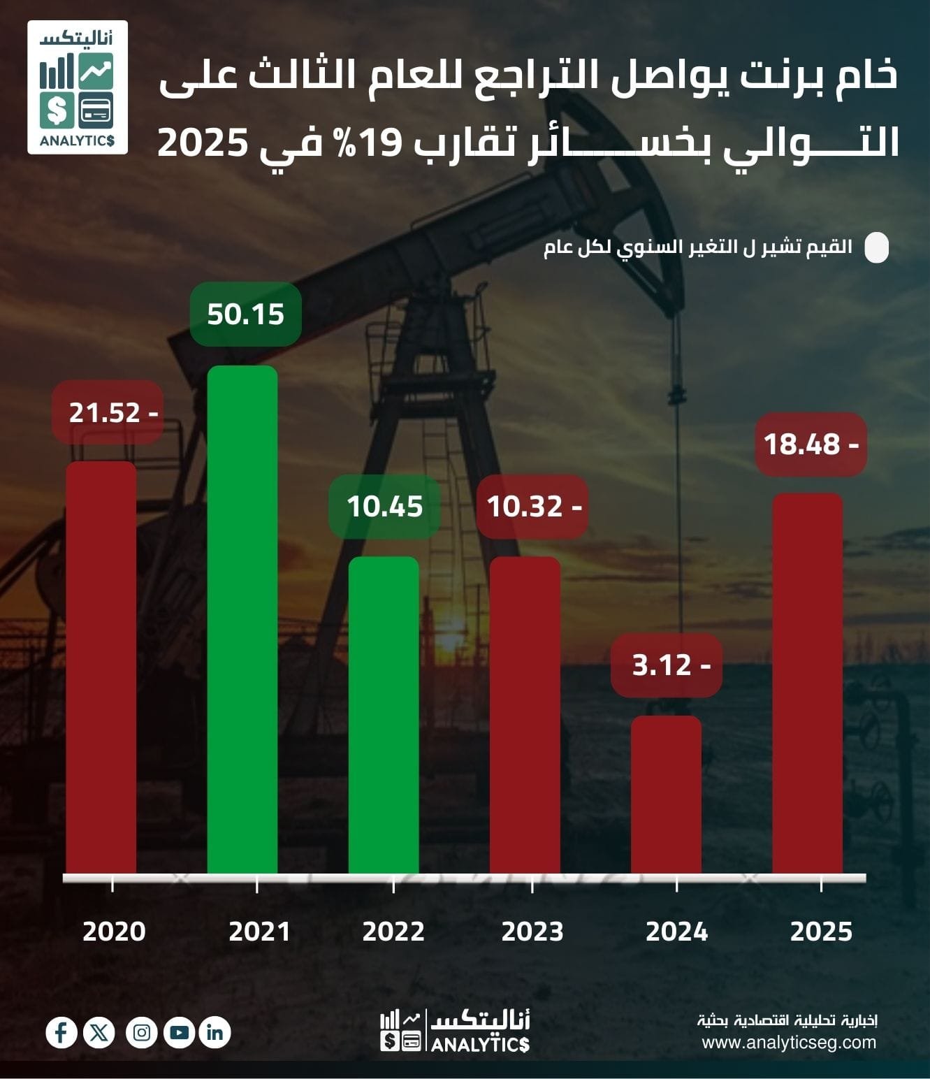 خام برنت يواصل التراجع للعام الثالث على التوالي بخسـائر تقارب 19% في 2025