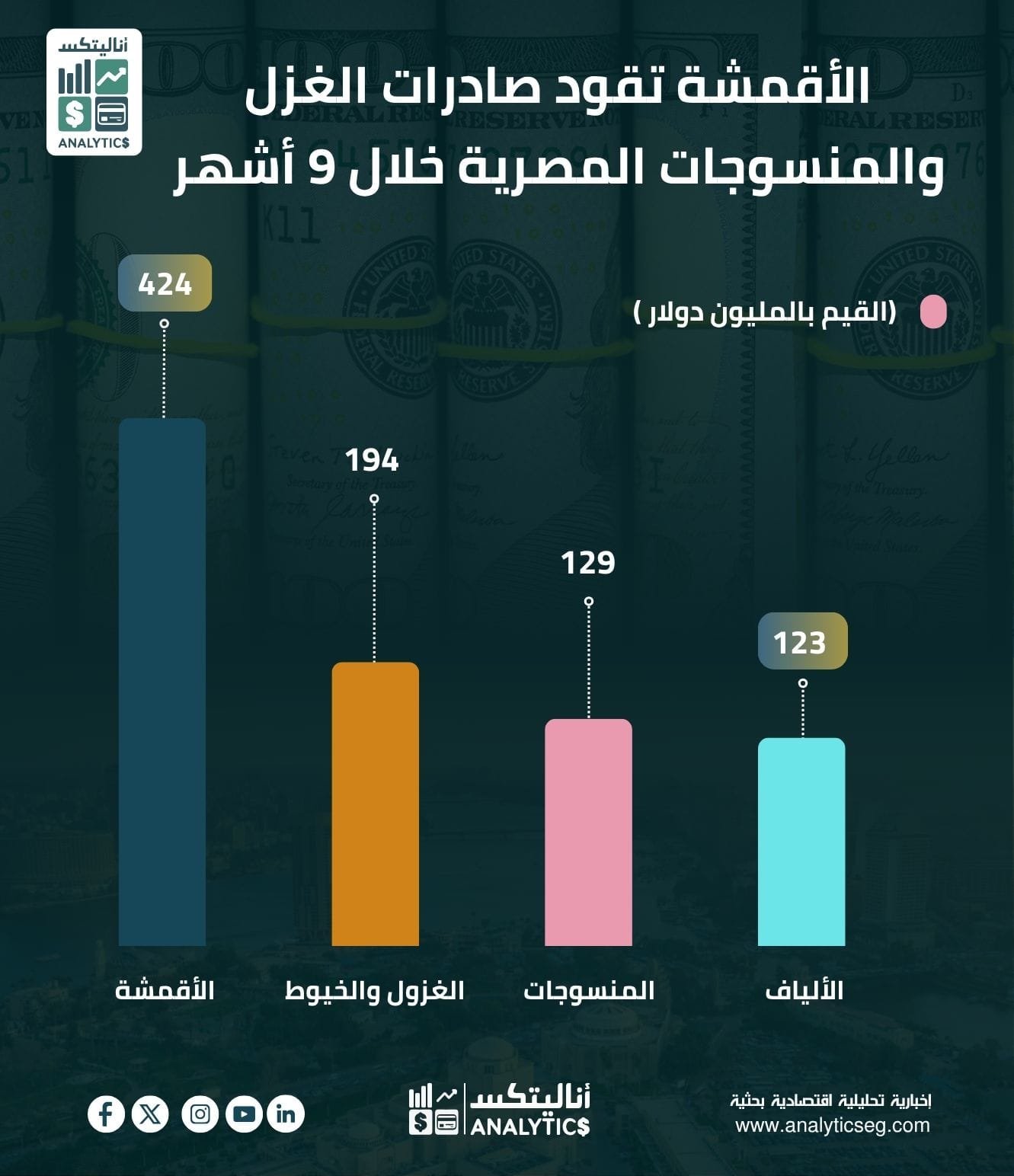 صادرات الغزل والمنسوجات ترتفع 3.4% خلال 9 أشهر لتسجل 875 مليون دولار29 أكتوبر 2025 - 5:42 مساءً أناليتكس