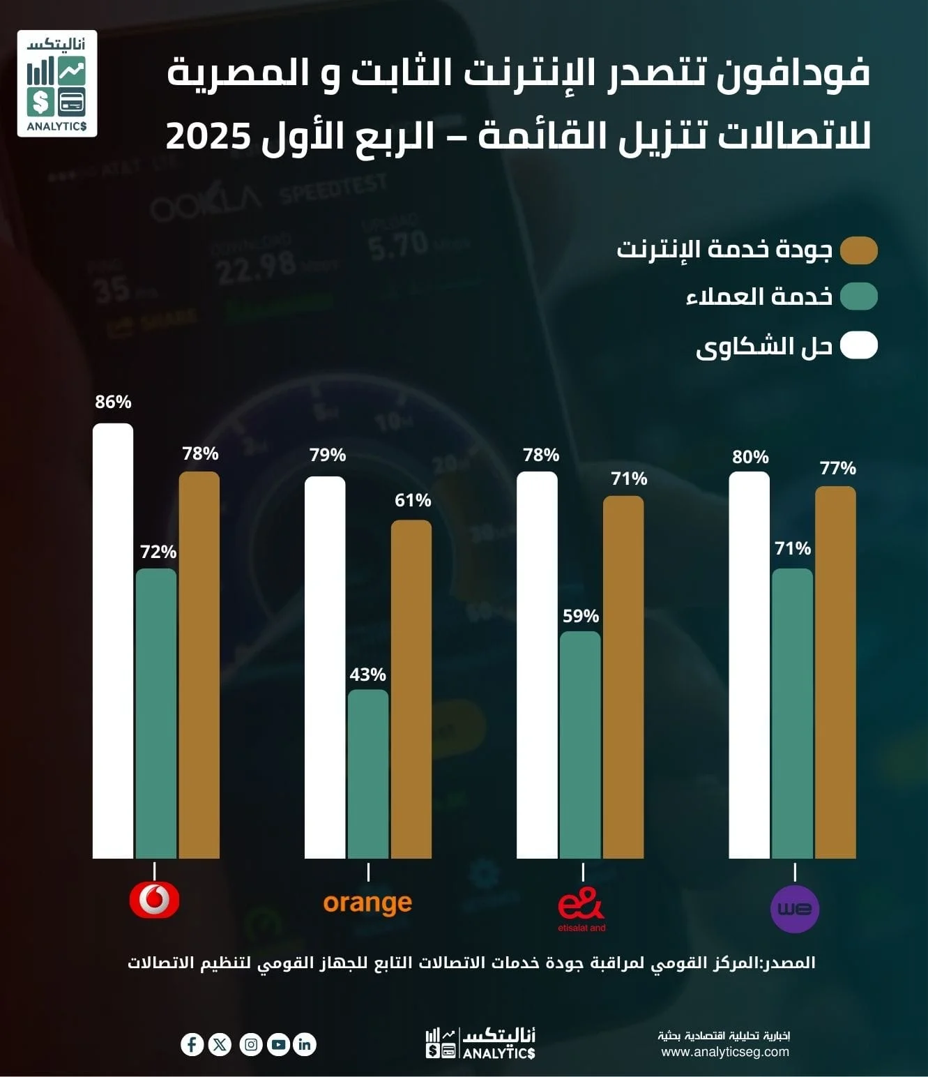 فودافون تتصدر مؤشرات جودة الإنترنت الثابت بنسبة 86% و المصرية للاتصالات تتزيل القائمة24 أغسطس 2025 - 4:56 مساءً أناليتكس