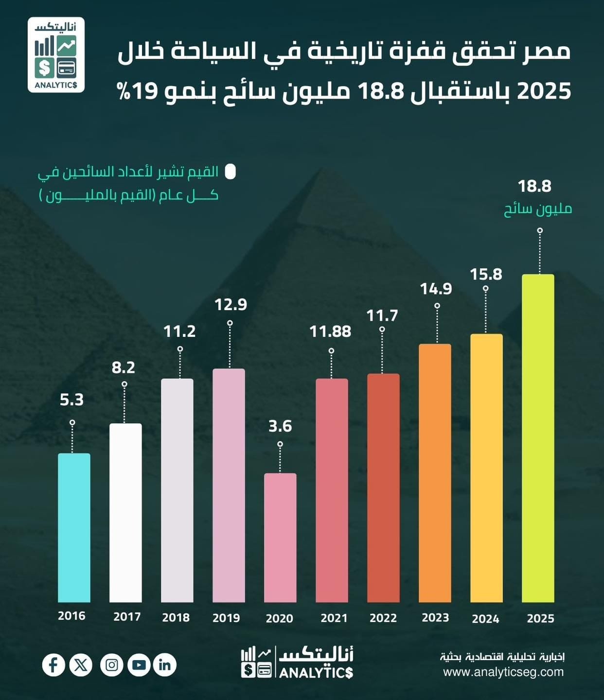 2025 يشهد طفرة غير مسبوقة مع وصول عدد السائحين إلى 18.8 مليون زائر، بزيادة 19% تعكس ثقة العالم في المقصد المصري وتنوعه بين التاريخ والشواطئ والثقافة.